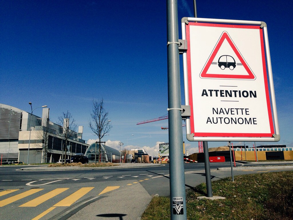 A défaut d’avoir pu photographier la navette automatique de l’EPFL (école polytechnique fédérale de Lausanne), je vous présente le panneau de signalisation la mettant en avant.